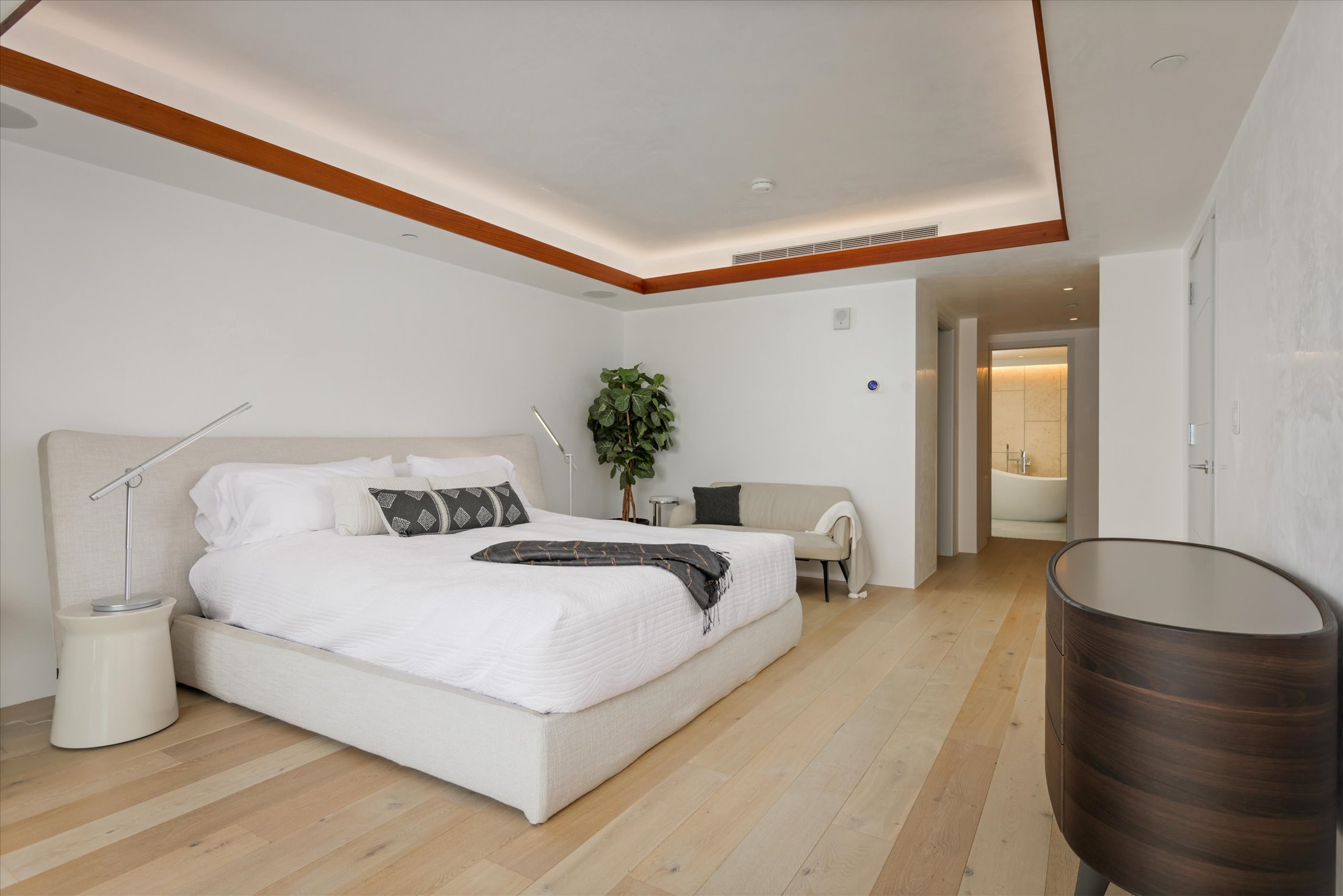The open-concept kitchen is designed for functionality featuring a premium appliance suite by Wolf, Sub-Zero, and Miele, along with generous storage and thoughtfully integrated finishes. Both bedroom suites are generously proportioned, offering spa-like bathrooms.